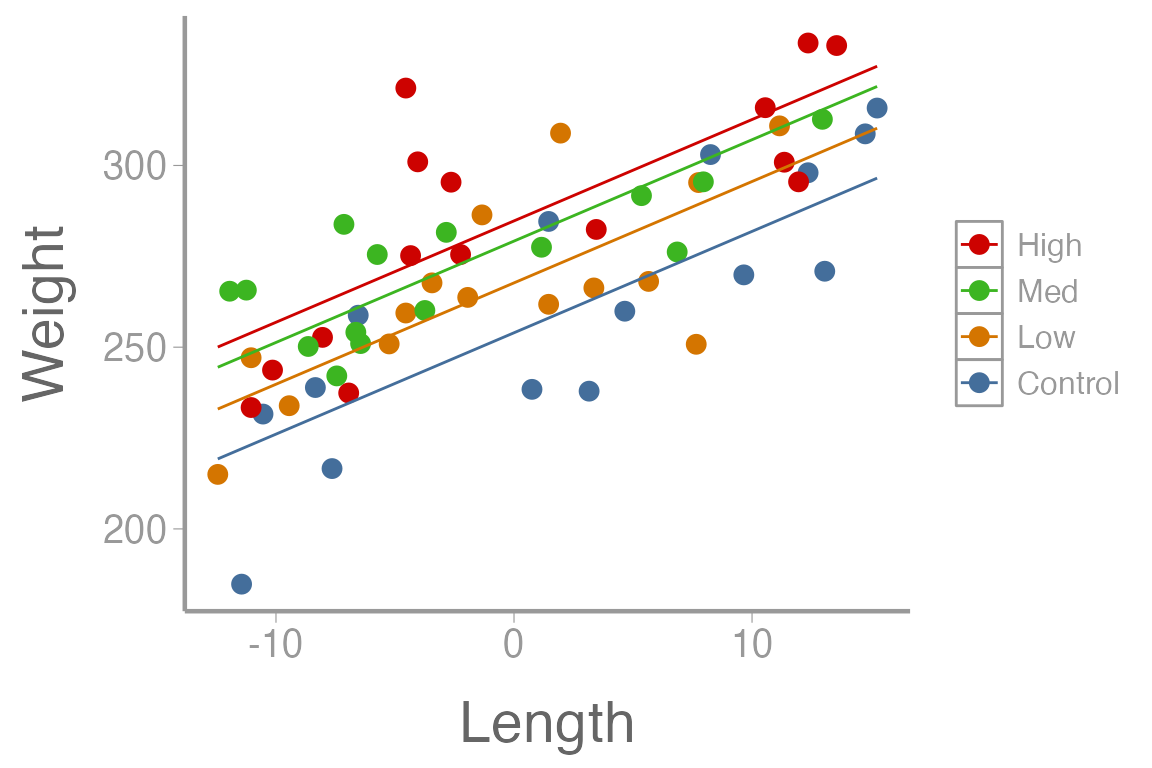 Below is a dataset which contains information about Blue Tilapia (Oreochromis aureus), a species of fish which are sometimes used in aquaponics systems. In this case, a researcher is interested in understanding how various diet regimens affect tilapia weight (g) after a period of 3 months. While performing this study, he would like to take into account the length (cm) of each fish at the start of the study. Given that longer fish tend to weigh more, he suspects that ignoring this variable would not be appropriate.