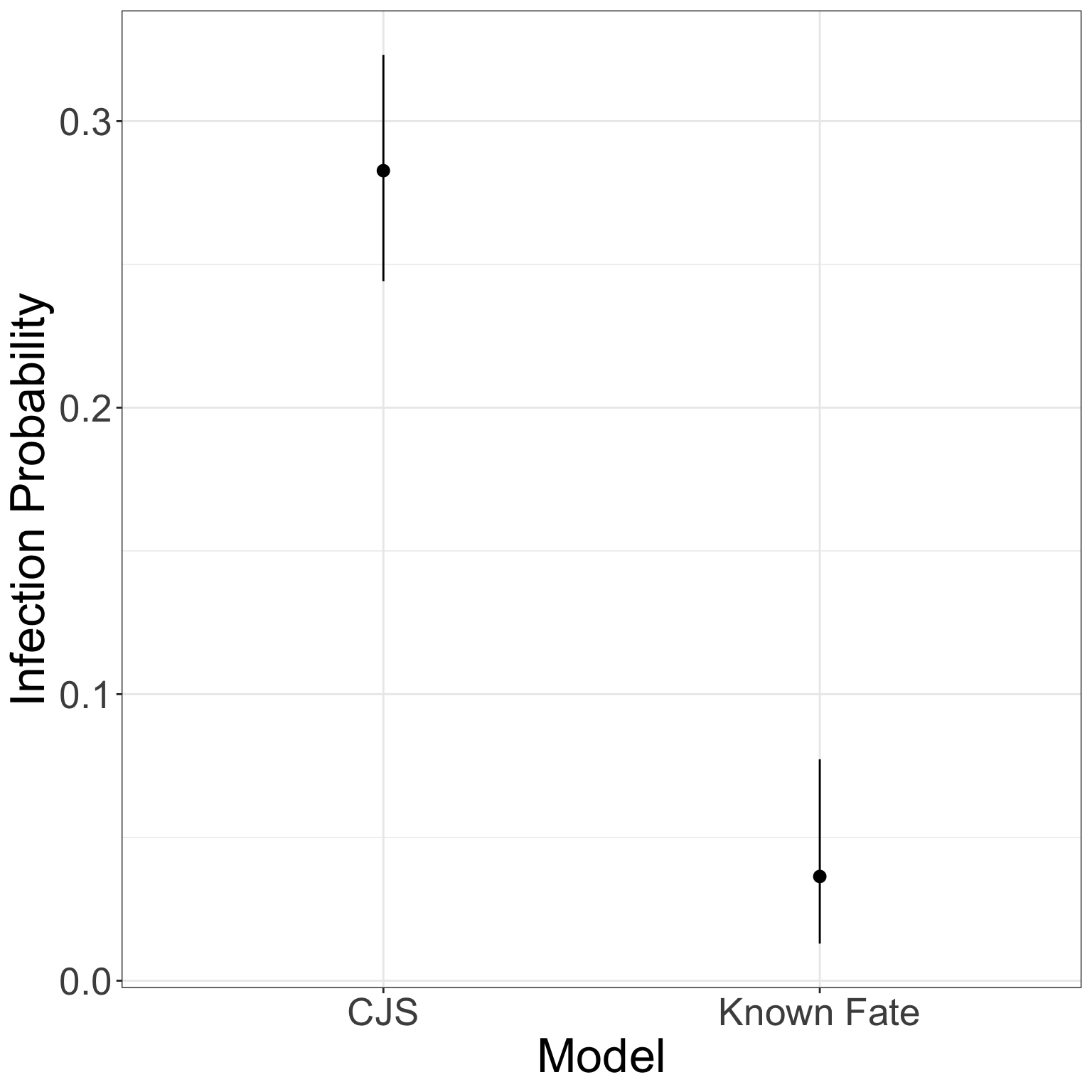 Lab10_CJS.RmdIn this exercise, we’ll look at how our estimates might change when we fit data with imperfect detection to both a known-fate and a CJS model. In this case, we’ll be using a CJS model to estimate ‘apparent infection rate’ rather than survival to demonstrate how these models can be used for more than just live/dead tracking of animals.