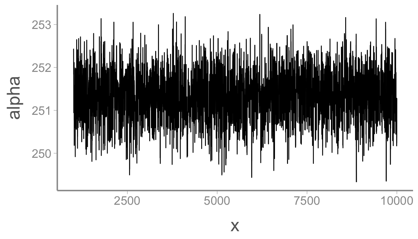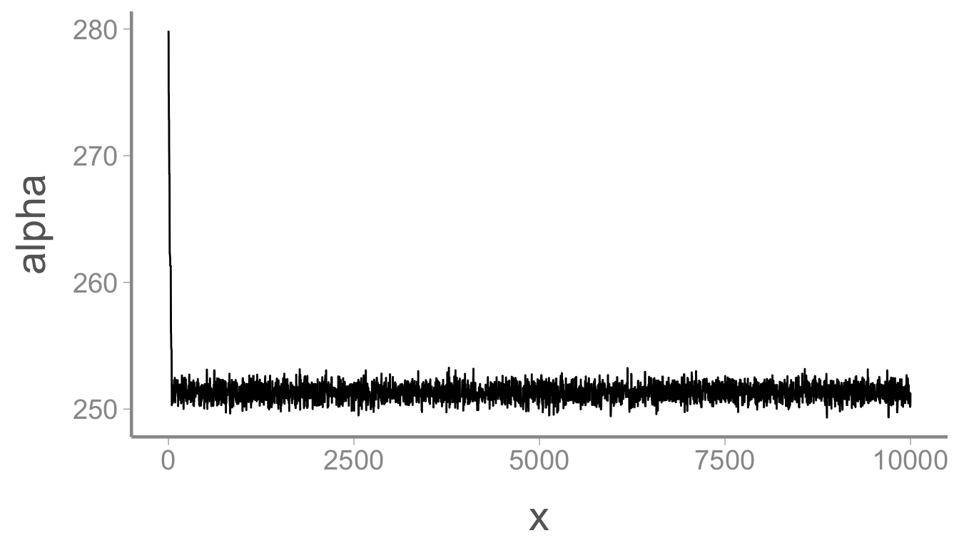 mcmc_df$alpha[1] <- runif(1, 200, 300) #change this to something reasonableRun your sampler again and print out the chain for \alpha. What do you see?