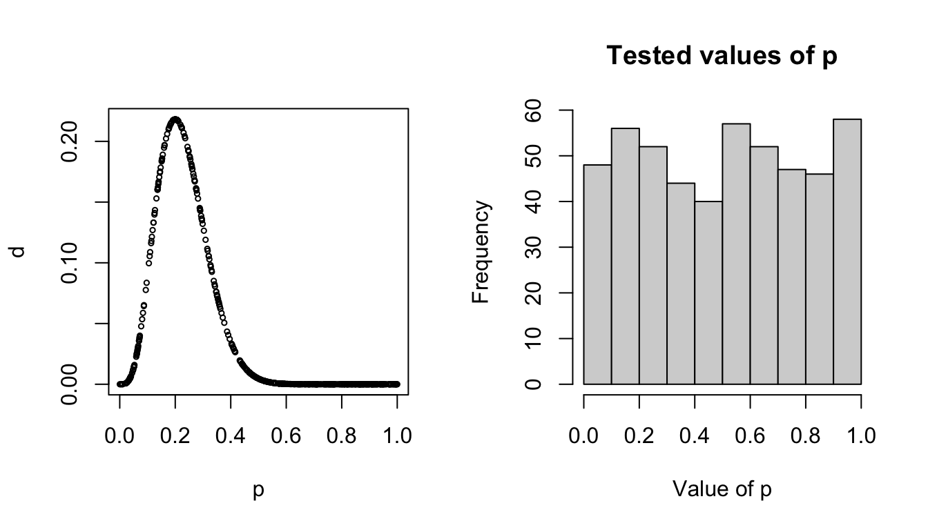 #> 16 4Looks like we have 16 zeros (“failures”) and 4 1’s (“successes”). Probably not a fair coin. But what if we want to estimate the probability of success? If it were truly fair, we’d expect a probability of 0.5.