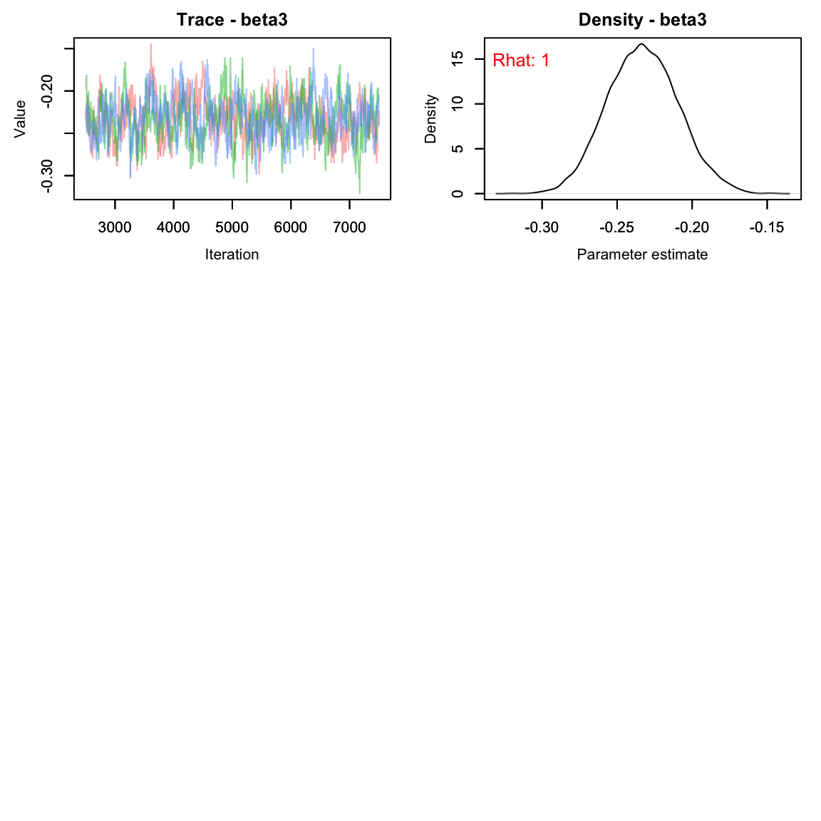 MCMCvis::MCMCtrace(falcon_res[,params[-5],], Rhat = T, pdf = F)