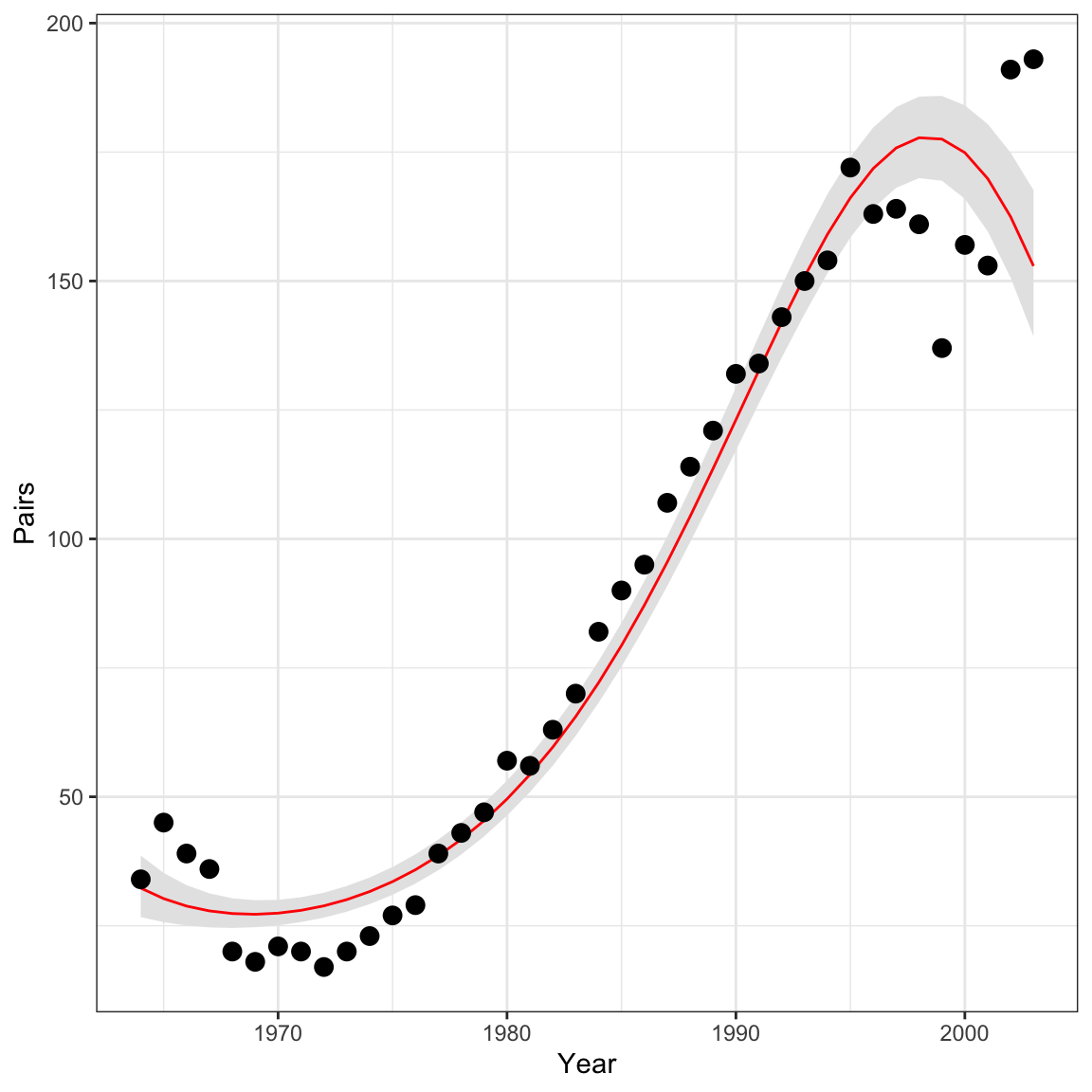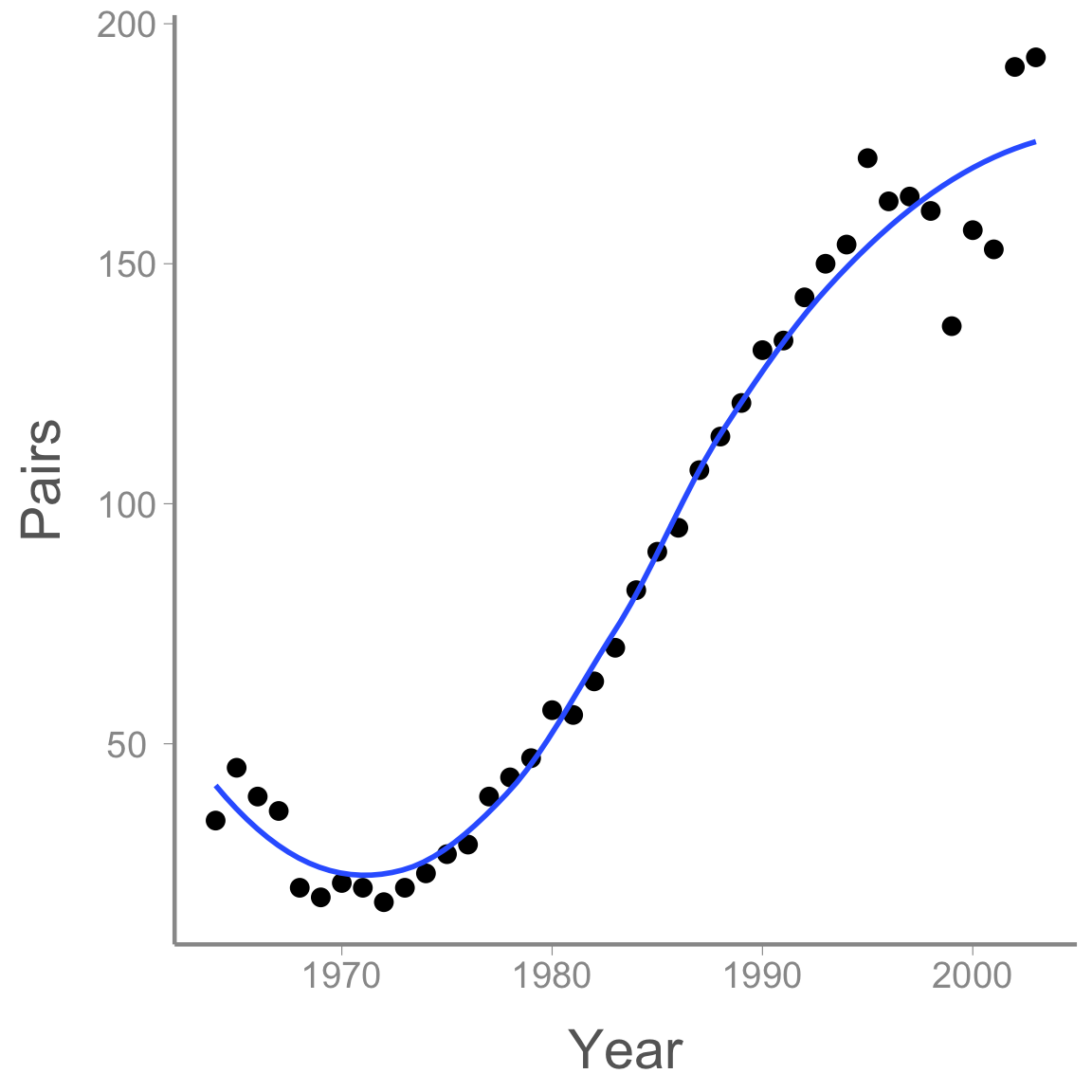 The first model we will fit examines change in the number of adult falcon pairs over time. Plotting the data shows that this change has not been linear: