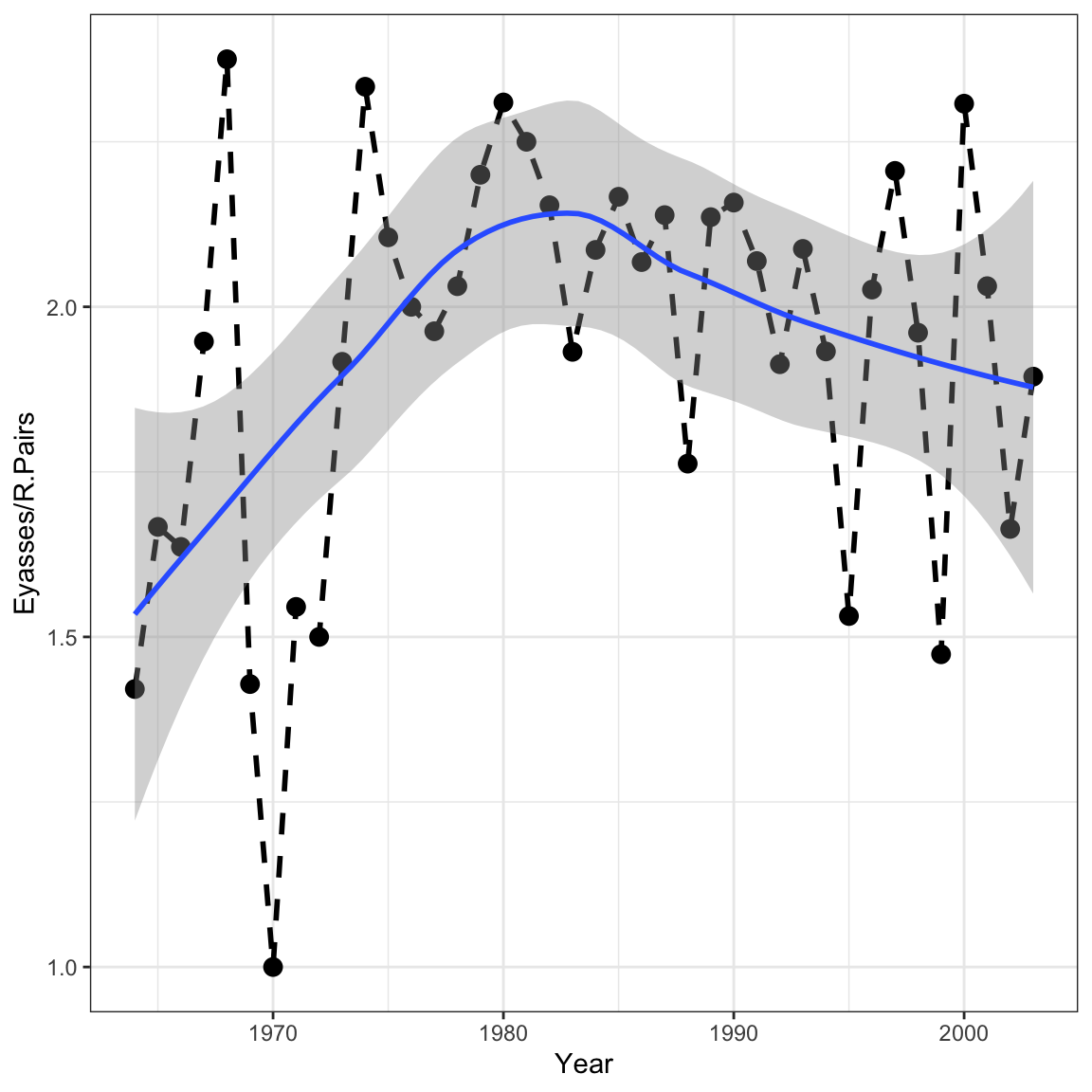 Using what you’ve learned in this lab, write out a model for the expected number of nestlings (Eyasses) per reproducing pair (R.pairs) in each year.