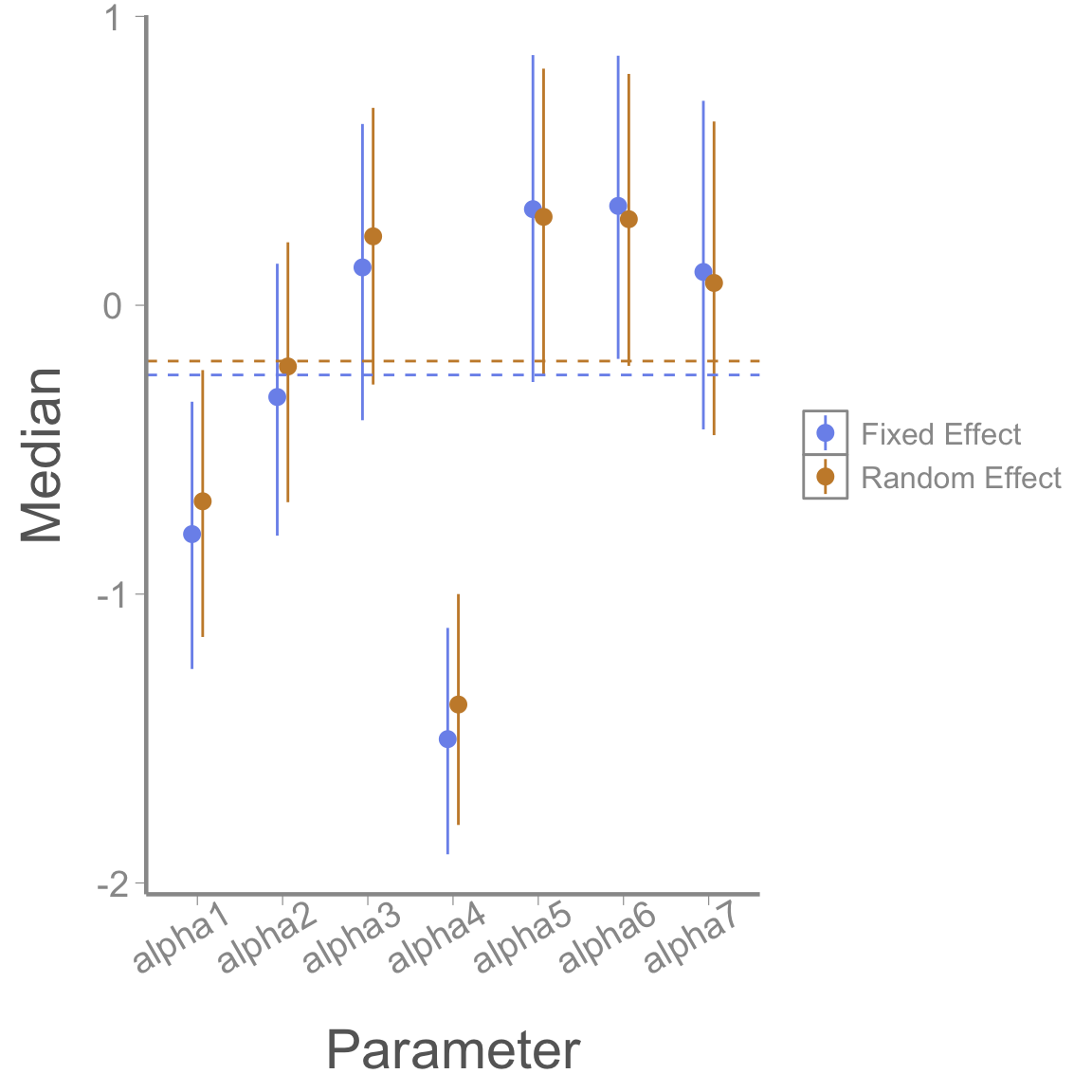 They seem to have mixed nicely. How do they compare to when we modeled alpha as a fixed effect? Let’s make a quick graph to compare.